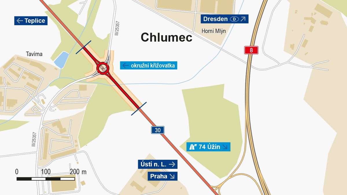 Okružní křižovatka nahradí stávající křižovatku na silnici I/30 u Chlumce.