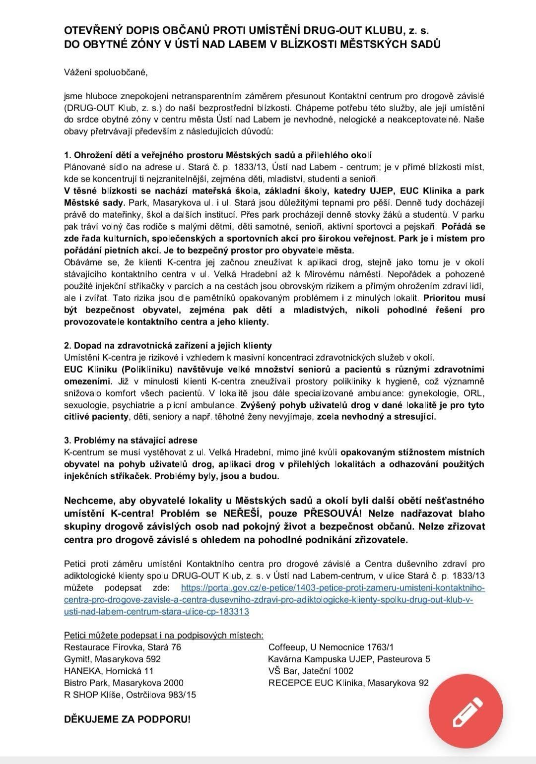 Otevřený dopis občanů lokality, vyzývající k podpisu petice.
