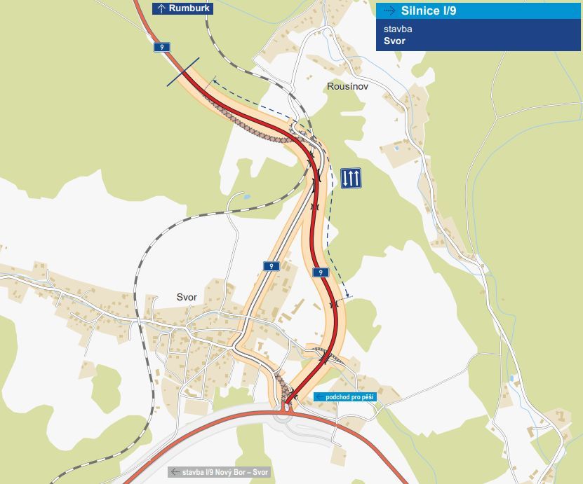 Svor leží na frekventované trase I/9 z Prahy přes Mělník a Českou Lípu do Šluknovského výběžku a na státní hranici s Německem v Rumburku na Děčínsku. Silnice, kterou využívá hlavně tranzitní doprava, je aktuálně vedena z křižovatky se silnicí I/13 průtahem přes obec Svor. Denně tudy podle posledního sčítání projede až 6500 aut, z toho zhruba tisícovka kamionů. Nová, bezmála dva kilometry dlouhá část silnice I/9 odvede tranzitní dopravu mimo obec.