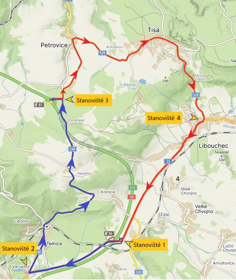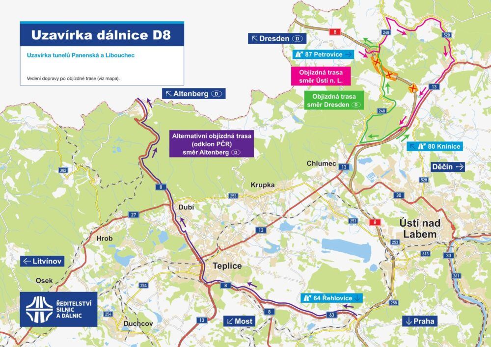 Na mapě jsou vyznačeny objízdné trasy včetně alternativní přes hraniční přechod Cínovec.