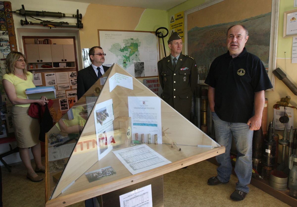 Bývalý policejní pyrotechnik Václav Bilický (první zprava) uvnitř svého Muzea pyrotechnické asanace, které vybudoval v Ralsku - Kuřívodech.
