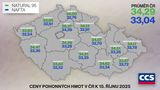 Nejlevnější paliva nyní natankují motoristé v Ústeckém kraji, kde litr benzinu vyjde v průměru na 33,80 korun. Nafta tam stojí průměrných 32,29 korun za litr.