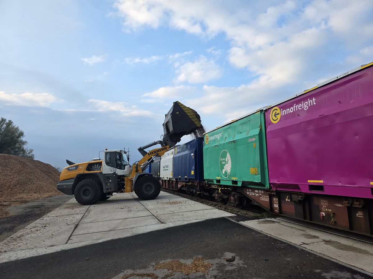 V pondělí přivezla první várku štěpky do tepláren první souprava tvořená devíti železničními vagóny. Celkem šlo o 27 kontejnerů naplněných dřevní hmotou o hmotnosti 360 tun a objemu 1242 metrů krychlových. Hmotnost vlaku dlouhého 180 metrů dosáhla zhruba 700 tun.