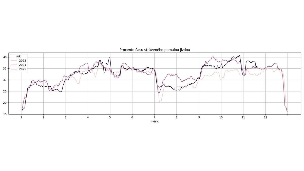 Z porovnání je také vidět, že řidiči tento měsíc tráví pomalou jízdou více času než loni a předloni. Aktuálně je to v průměru téměř 40 procent času, zatímco před rokem to bylo kolem 35 procent a předloni takřka 30 procent. Za pomalou jízdu se považuje taková, při níž auto jede pomaleji, než je 60 procent povolené rychlosti.