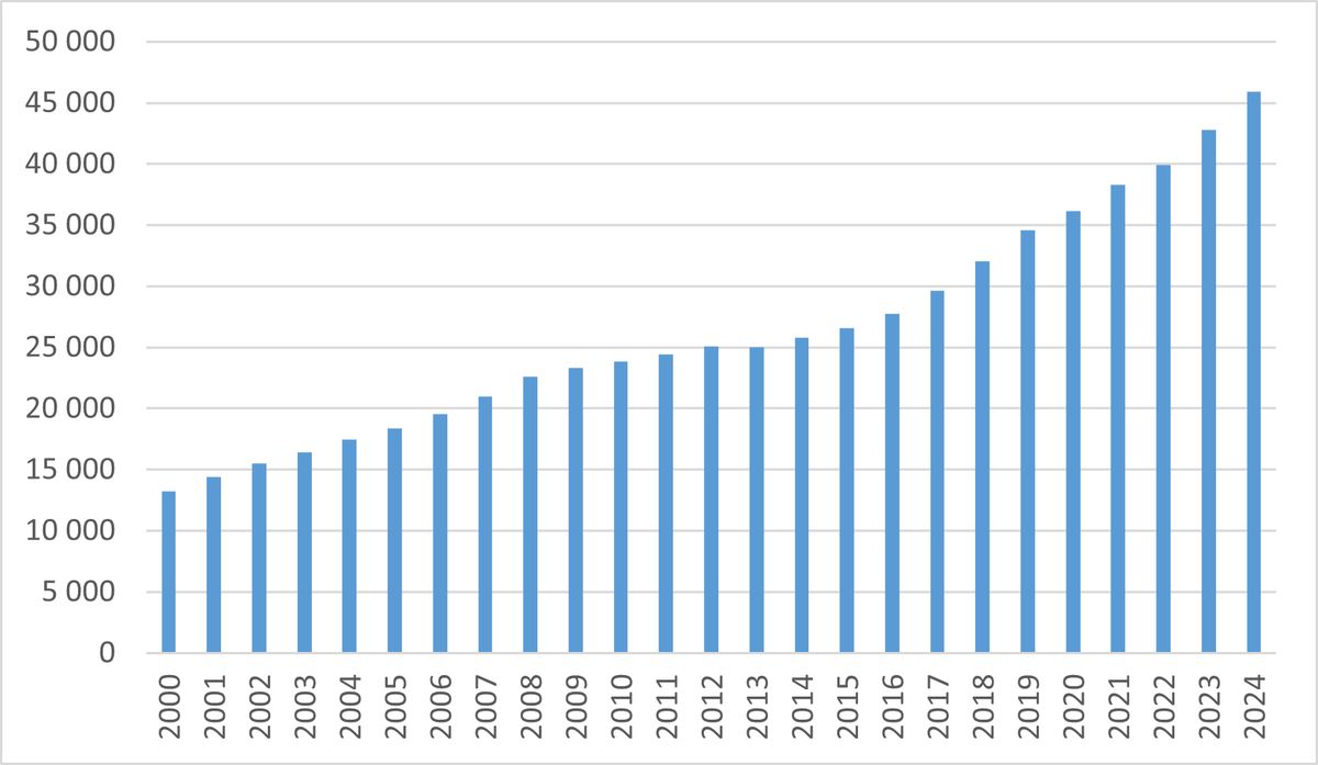 Přestože ceny potravin výrazně poskočily, lidé si jich mohou nakoupit více než před čtvrtstoletím. Zatímco mzdy vzrostly zhruba třiapůlkrát, ceny se zvýšily jen o něco víc než dvojnásobně. Průměrná hrubá mzda mezi lety 2000 a 2024 poskočila z necelých 13,5 tisíce korun na téměř 46 tisíc.