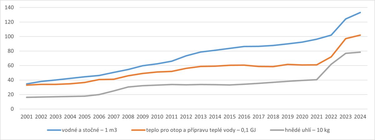 Výrazně narostly také náklady na energie a vodu. Cena tepla, hnědého uhlí a vodného se stočným se podle dat Českého statistického úřadu zvýšila z 84 korun v roce 2001 na 314 korun v roce 2024. Zdražení energií se přitom promítá napříč ekonomikou – od výroby potravin přes služby až po dopravu.