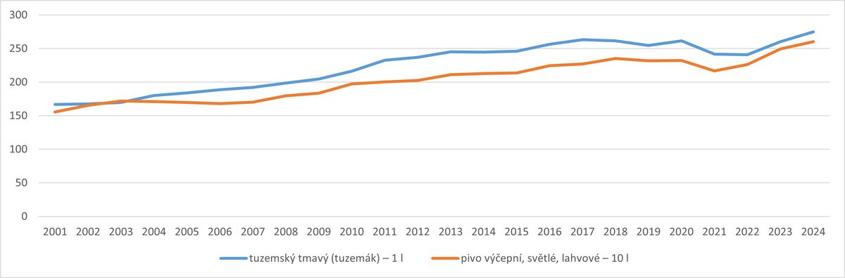 Zřetelný růst cen je patrný také u alkoholu. Zatímco v roce 2001 stál litr tuzemáku a 20 lahví piva zhruba 320 korun, v roce 2024 vyšel stejný nákup na 535 korun. Na ceny zmíněných nápojů mají vliv vyšší výrobní náklady i změny v daňových sazbách.