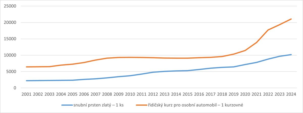 Vývoj ceny autoškoly a ceny snubního prstenu