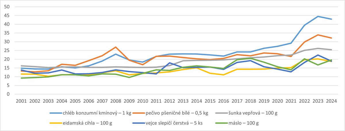 Na první pohled je vývoj patrný u základních potravin. Nákup pečiva, sýra, másla, vajec a šunky, který na začátku tisíciletí vyšel zhruba na sto korun, dnes stojí přibližně dvojnásobek. Zatímco v roce 2001 lidé zaplatili 79 korun a největší položkou byla šunka, v roce 2024 dali za stejný nákup 158 korun, nejvíce za chléb.