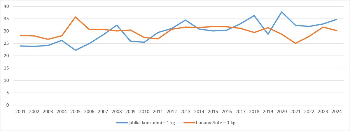 U ovoce je vývoj odlišný. Podle dat statistického úřadu rostla cena banánů a jablek hlavně mezi lety 2001 až 2013, dále už zůstávala spíše stabilní. „Roku 2001 člověk za průměrnou mzdu mohl pořídit 510 kilogramů banánů, roku 2024 už 1520 kilogramů, takřka trojnásobek,“ zmínil srovnání hlavní ekonom Trinity Bank Lukáš Kovanda.