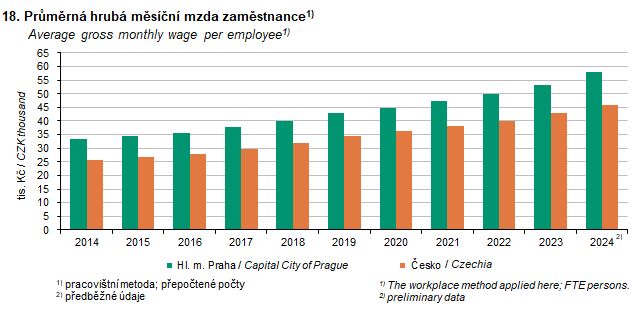 Nejsilnější ekonomickou pozici si dlouhodobě udržuje Praha. Vytváří přibližně čtvrtinu celostátního HDP, přestože v ní žije necelých 13 procent obyvatel Česka. Hlavním důvodem je koncentrace firem, státních institucí i velký počet zaměstnanců dojíždějících z ostatních krajů. Nadprůměrné jsou i mzdy. V roce 2024 dosáhla průměrná hrubá mzda v Praze téměř 58 tisíc korun, zatímco celorepublikový průměr činil necelých 46 tisíc.
