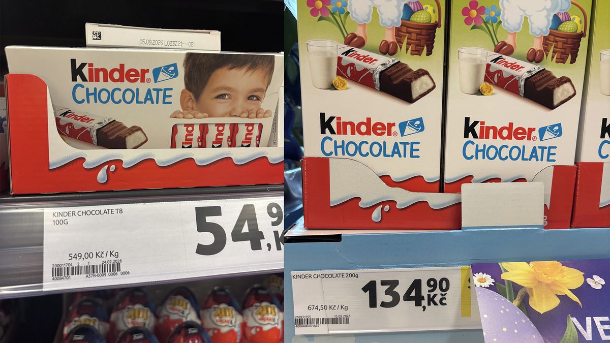 Stejný případ jako u Toffifee v Albertu se objevuje například u Kinder Chocolate v Tesku. Zatímco celoroční balení 100gramové pochoutky vyjde na 55 korun, za 200 gramů v obalu s velikonoční ovečkou zaplatí zákazník už 135 korun. Tedy o více než 130 korun za kilogram.