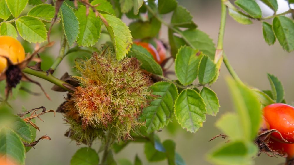 Při sběru šípků si možná všimnete zvláštní hnědočervené chlupaté koule velké asi 6–8 centimetrů. Na větvích vypadá jako mechový chomáček, ale ve skutečnosti jde o fascinující přírodní útvar – šípkovou hálku. Vzniká, když malá vosička, žlabatka listová, naklade na keř vajíčka. Larvy pak po vylíhnutí začnou konzumovat rostlinná pletiva, která se zduří a vytvoří kolem nich ochranné „mechové domečky“, hálky.