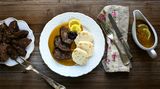 - Přisypte na kostky nakrájené maso, osolte, opepřete a zprudka ho opečte ze všech stran, aby se zatáhlo. Přidejte jalovec, tymián a bobkový list. Zalijte vínem, nechte ho krátce odvařit a poté podlijte vývarem.