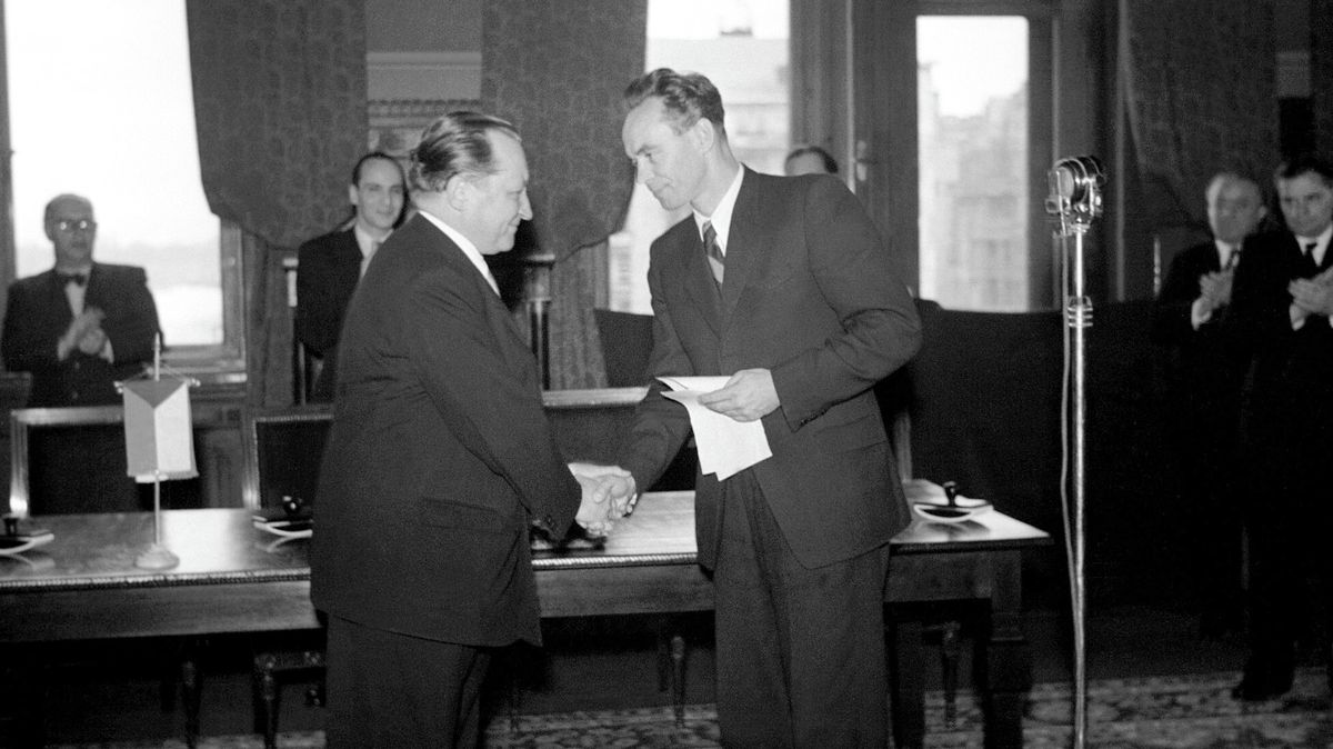 Maďarský ministr zahraničí Maďarska László Rajk při projevu po podpisu Smlouvy o přátelství, spolupráci a vzájemné pomoci mezi Maďarskem a Československem v dubnu 1949. Následovala jednání slovenské a maďarské delegace na Štrbském plese, majetkové problémy ale zůstaly nevyřešeny.