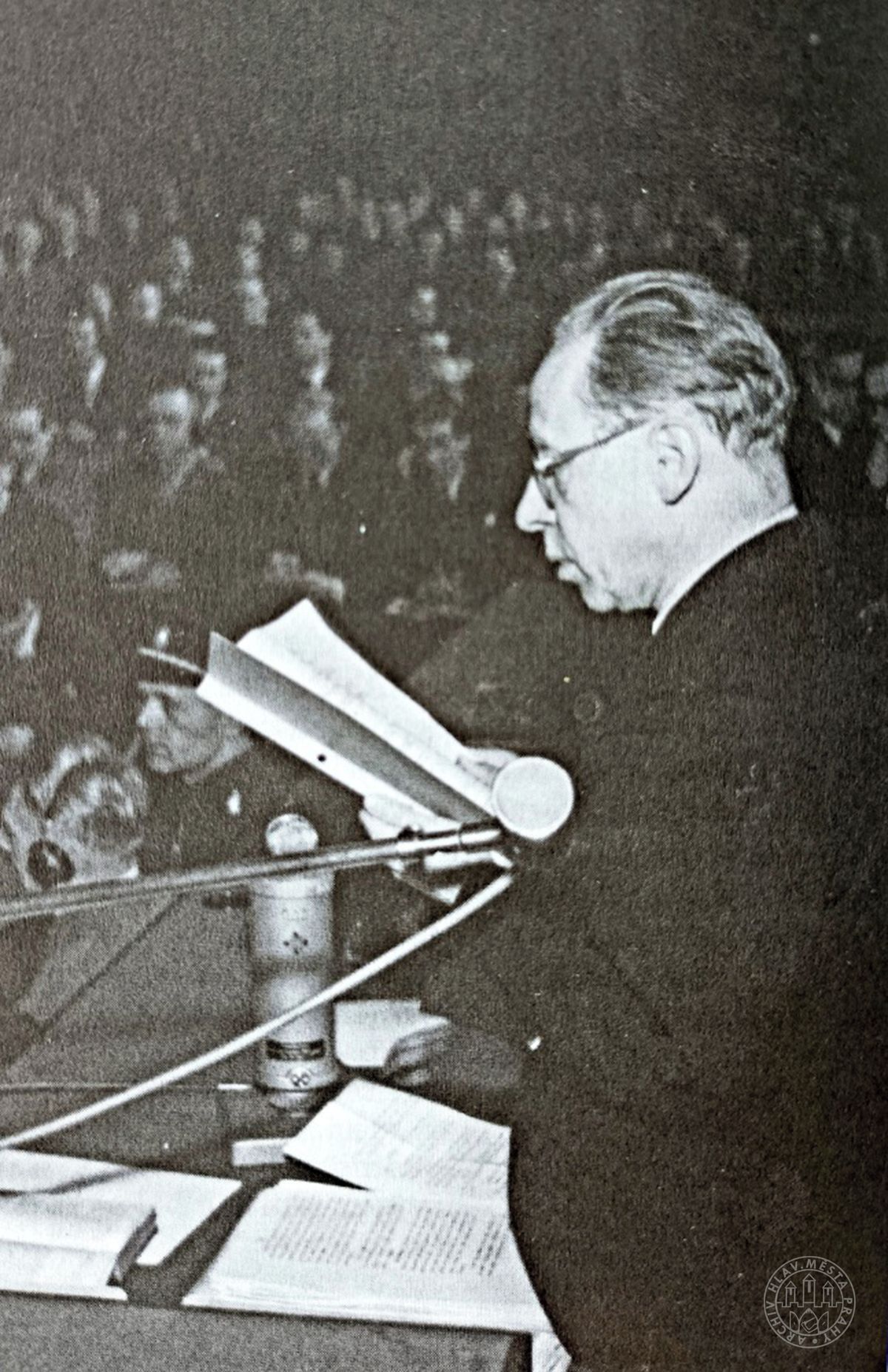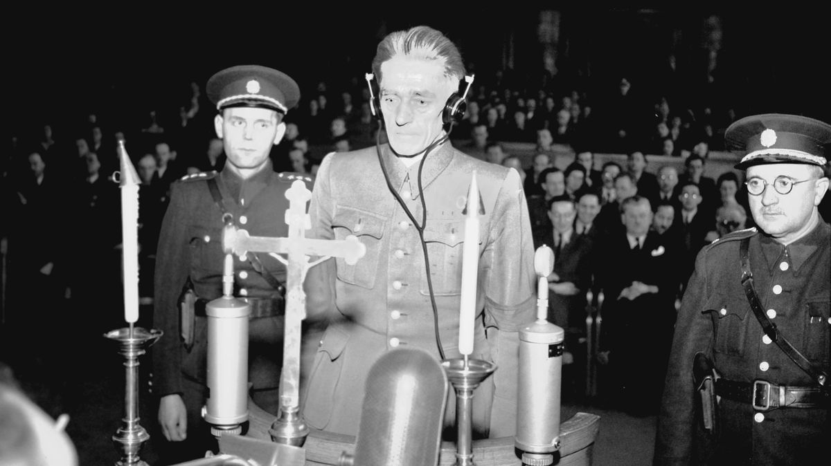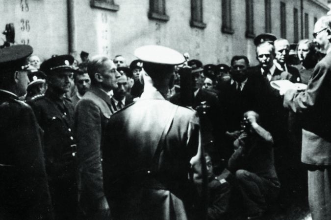 Předseda JUDr. Vladimír Kozák čte 22. května 1946 před popravou K. H. Franka rozsudek Mimořádného lidového soudu.