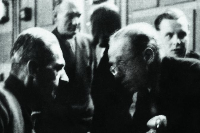 Karl Hermann Frank (vlevo) a jeho obhájce Kamill Reslerv soudní síni na Pankráci v březnu 1946.