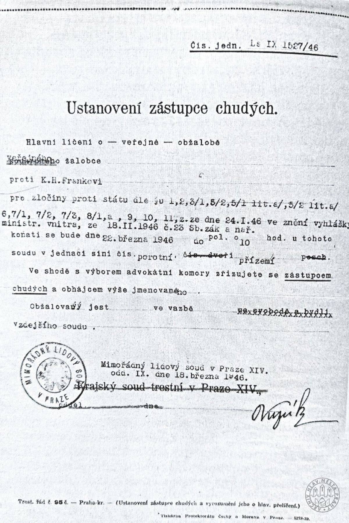 Archivní dokument, jímž je Kamill Resler ustanoven advokátek ex offo K. H. Franka.