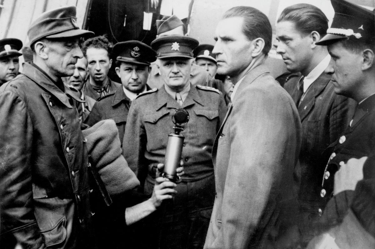Dne 8. srpna 1945 byl letadlem dopraven do Prahy a Američany předán nacistický zločinec Karl Hermann Frank (vlevo). Na letišti ho převzal dr. Bohuslav Ečer (uprostřed v uniformě), člen mezinárodní komise pro vyšetřování válečných zločinců.
