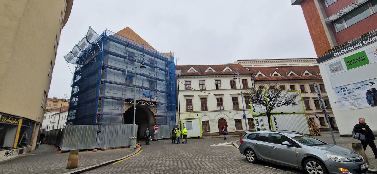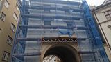 Měnínská brána zakrytá lešením. Nyní se rekonstruuje.