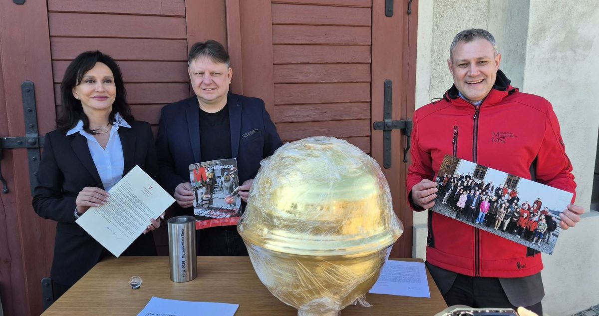 Ukládání písemností do časové schránky (na stole stříbrný tubus a vedle pozlacená makovice). Zprava ředitel Muzea města Brna Zbyněk Šolc, uprostřed náměstek brněnské primátorky René Černý (ANO) a zcela vlevo náměstkyně primátorky Karin Podivínská (nestr.).
