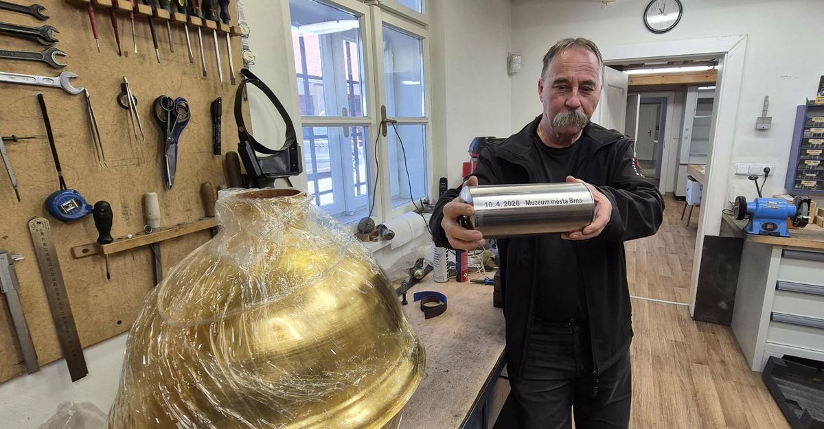Vytvořit schránku byl technický oříšek. V nejvyšším bodu střechy je totiž hromosvod, na němž bude makovice s využitím stavebního jeřábu nasunuta, a to společně s časovou schránkou. Je kovová, nese nápis Muzeum města Brna a je dutá, aby se také dala na hromosvod nasunout.