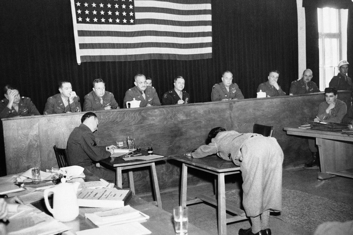 Rudolf Wolf, vězeň v koncentračním táboře Dachau, předvádí před soudem polohu, kterou musel vězeň zaujmout při výprasku. Dr. Franz Blaha, československý patolog a fyziolog, který byl čtyři roky vězněn rovněž v Dachau, označil během svého svědectví u procesu sedmnáct ze čtyřiceti obžalovaných jako účastníky krutostí páchaných v táboře. Proces začal 16. listopadu 1945 přímo v bývalém koncentračním táboře.