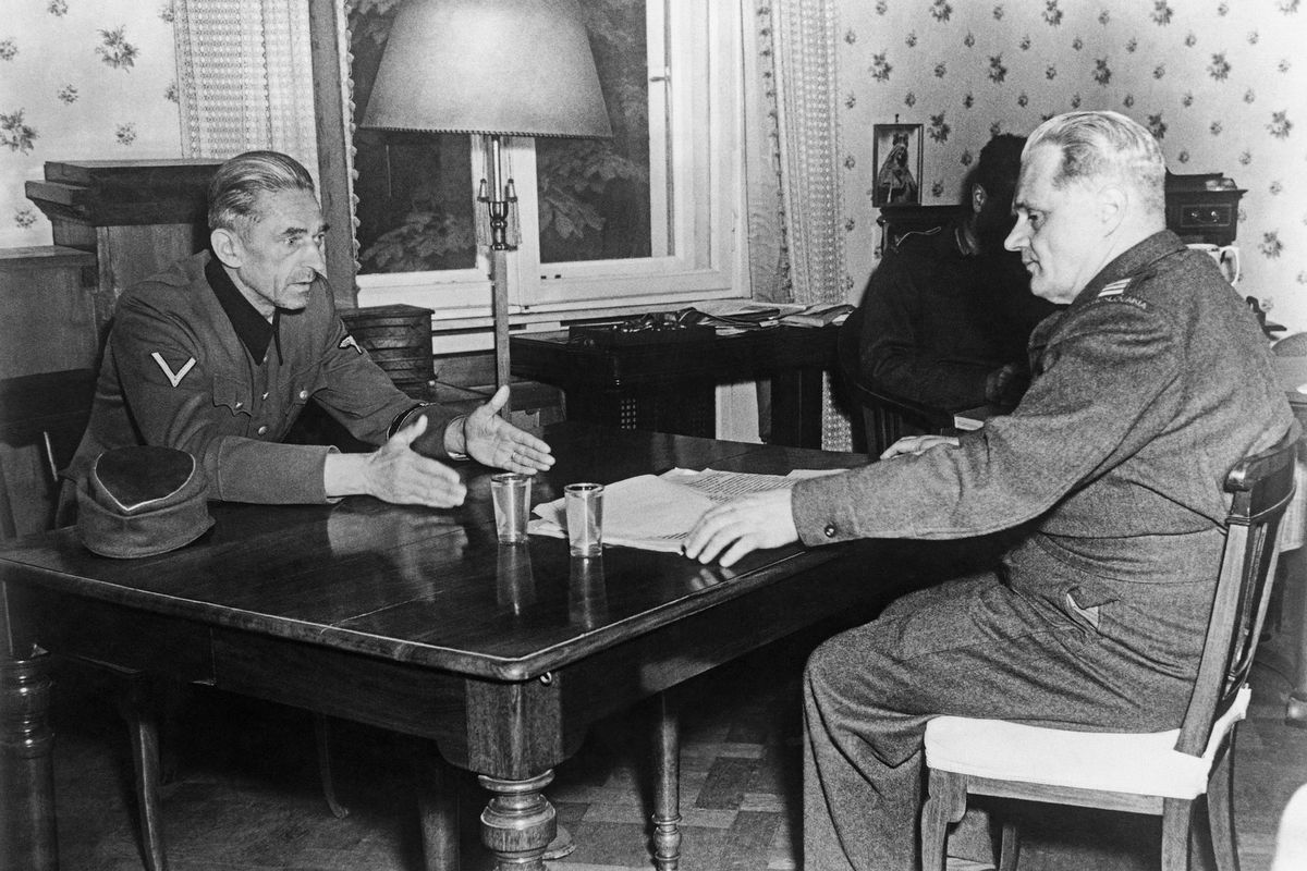 Bývalý německý státní ministr pro Čechy a Moravu Karl Hermann Frank (vlevo) při prvním výslechu, který vedl Bohuslav Ečer.