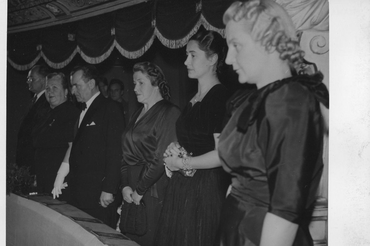 Magda Husáková-Lokvencová (pátá zleva) s Klementem Gottwaldem (třetí zleva) a jeho ženou Martou (druhá zleva). Archiv Husákovy rodiny