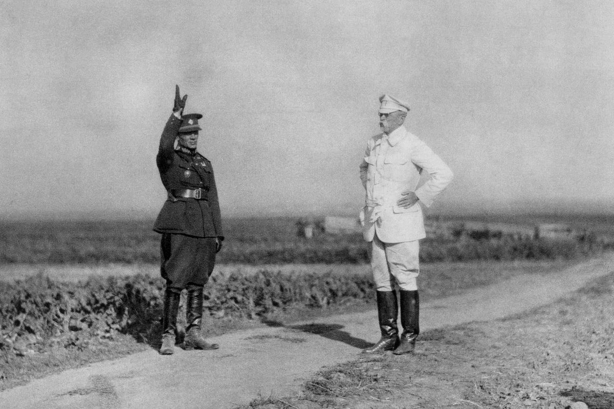 Prezident Tomáš Garrigue Masaryk s generálem Sergejem Vojcechovským na manévrech na Moravě v roce 1927.