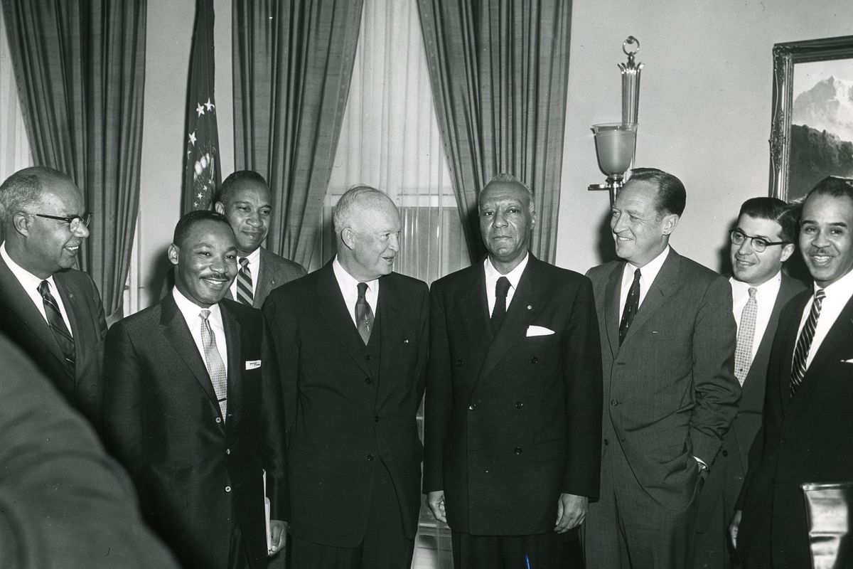 V Bílém domě v červnu 1958: prezident Dwight Eisenhower přijal delegaci Národní asociace pro povznesení barevných kidí, po jeho pravici Martin Luther King, Jr..