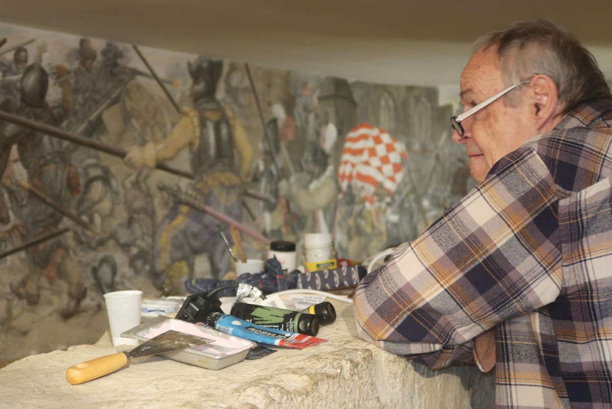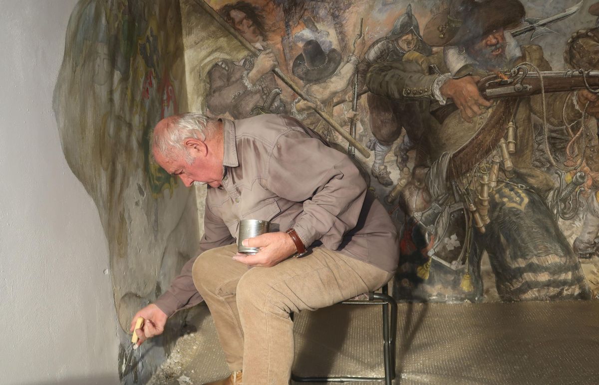 Miloslav Čech opravuje panorama znázorňující dobytí Plzně v roce 1618.