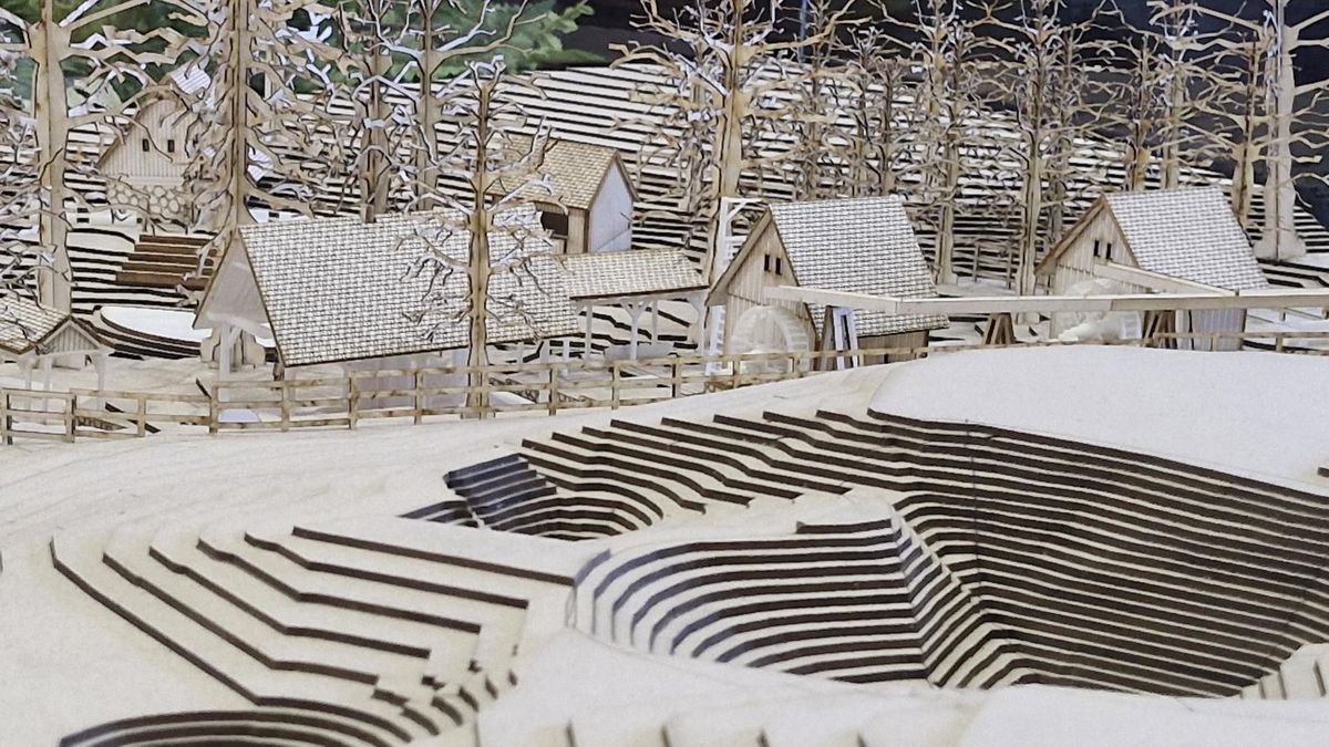 Model ukazuje budoucí hornickou osadu Stříbrná huť v sousedství jihlavské štoly sv. Jiří v měřítku 1 : 100.