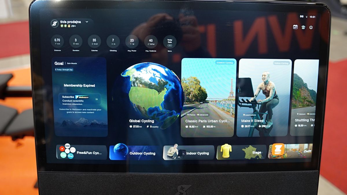 Dominantou celého stroje je 21,5palcový Full HD displej. Obrazovka se dá horizontálně otočit až o 90 stupňů a naklápět v rozsahu 0 až 42 stupňů, aby na ni jezdec dobře viděl i při intenzivním šlapání. O chod systému se stará osmijádrový procesor s pamětí 8 GB a úložištěm o kapacitě 128 GB.