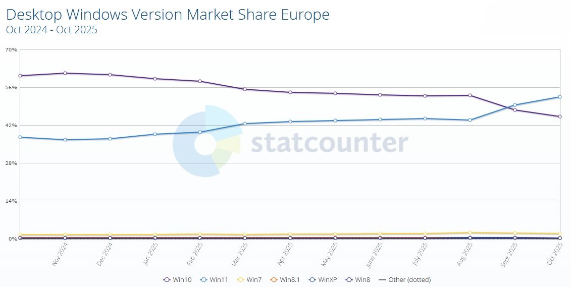 Proti tomu popularita Windows 11 v Evropě neustále roste, a to i navzdory tomu, že lidé kvůli prodloužené podpoře zadarmo zatím nemusí na jedenáctky přecházet. Ze srpnových 43,83 % povyskočila v září na 49,51 % a v říjnu na 52,44 %.