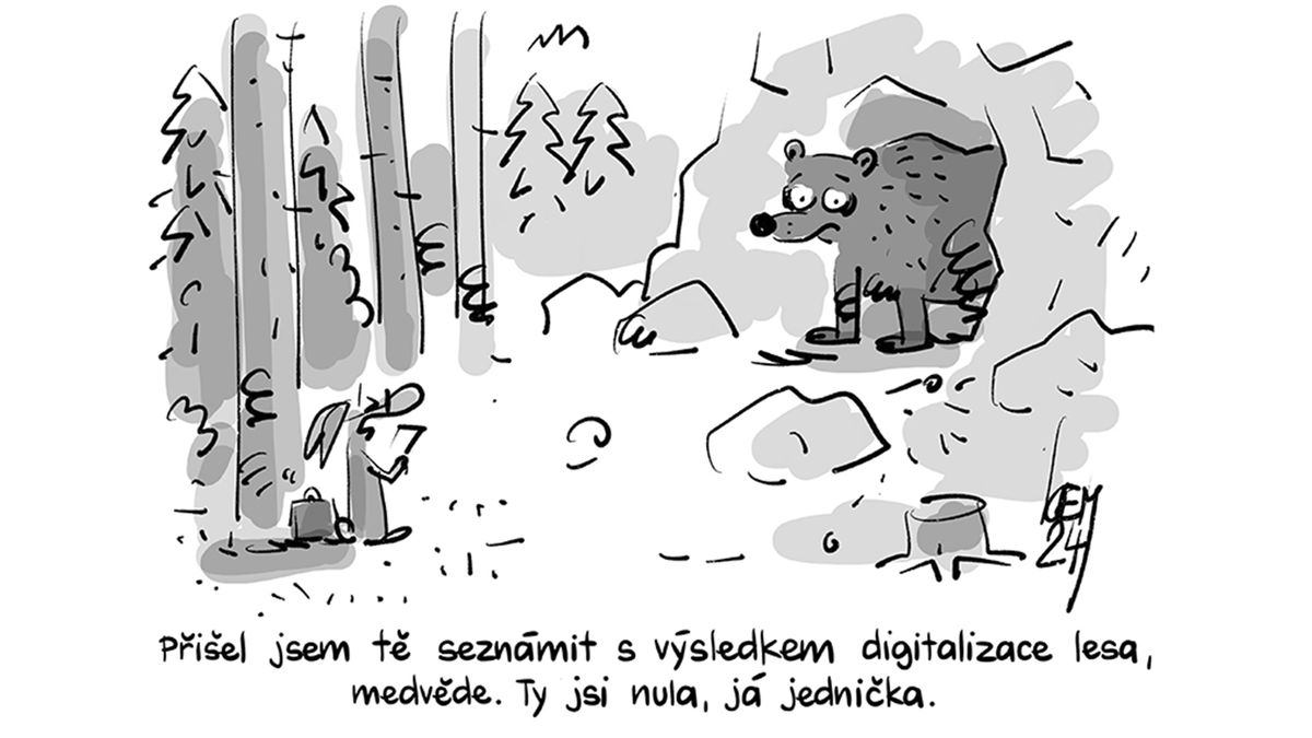 Přišel jsem tě seznámit s výsledkem digitalizace lesa, medvěde. Ty jsi nula, já jednička.