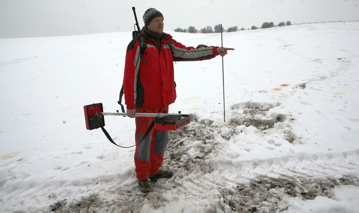 Leden 2010. Walter Pavliš s detektorem kovů u Křenova hledající Slavkovský poklad