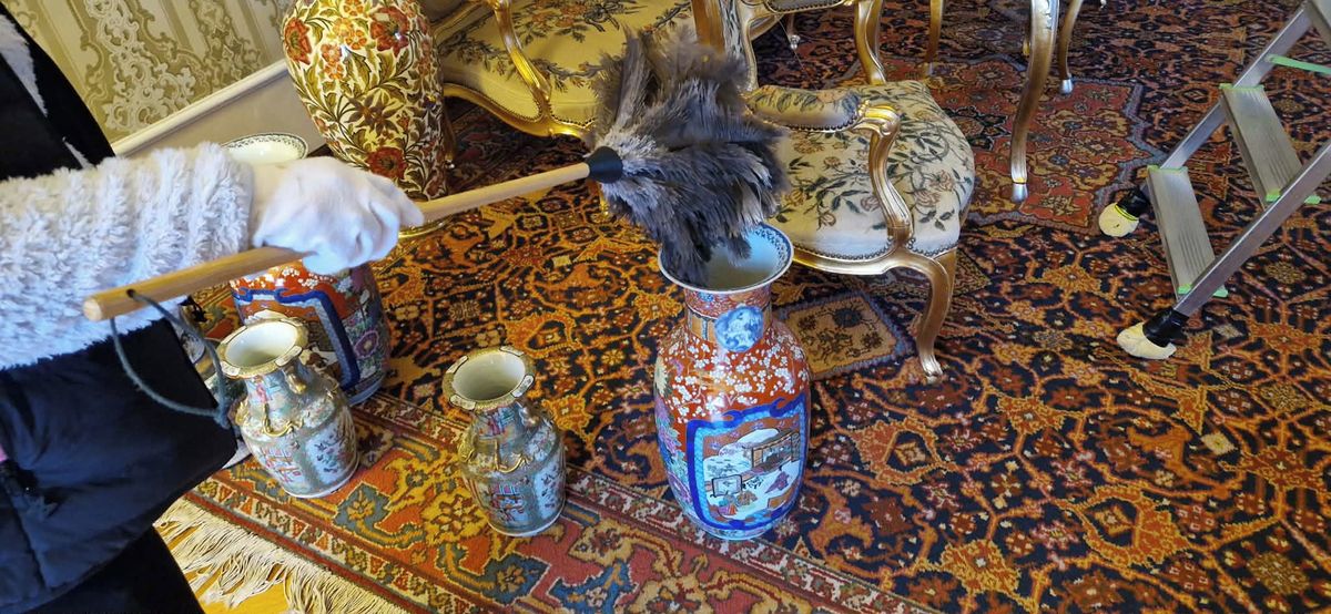 Zlomovým okamžikem a současně nejobtížnějším místem na úklidovém putování z jedné zámecké komnaty do druhé je prokletá malá jídelna. Toho porcelánu. Každý kousek se musí vzít velmi opatrně do ruky a přetřít. Hra nervů čeká na uklízeče ještě později v depozitáři při čištění japonské keramiky. Je sice krásná a vzácná, ale současně i mimořádně křehká.