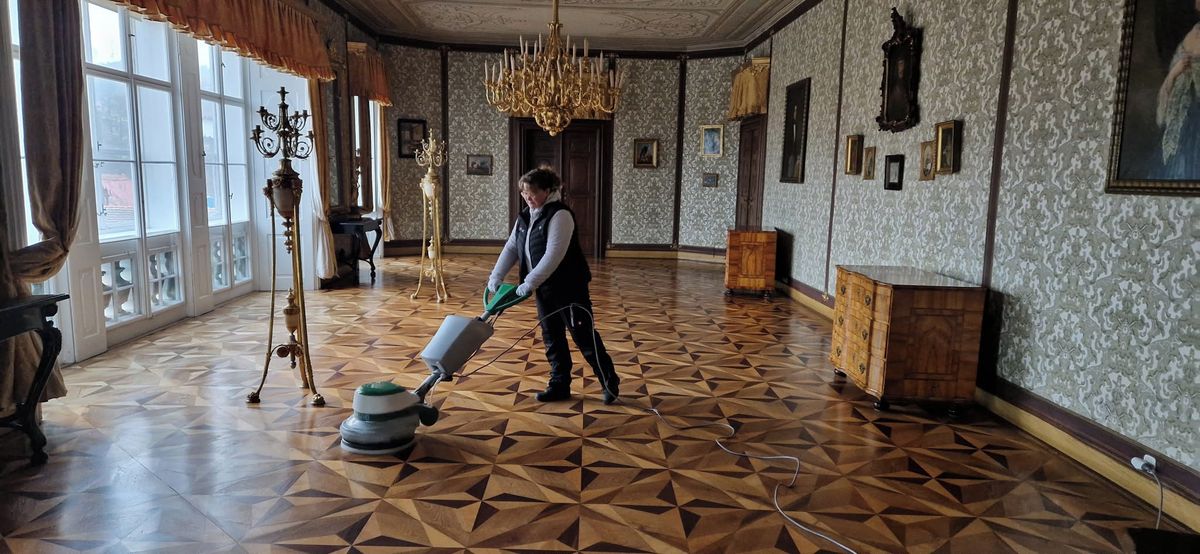 I na zámku Lysice se leští podlahy.