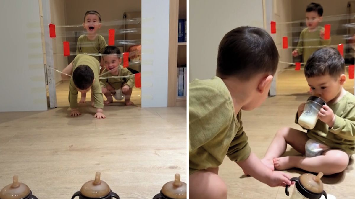 Na záznamu je vidět, jak trojčata přicházejí k průchodu mezi dvěma místnostmi, který je uzavřený průhlednými páskami. Když chlapci zahlédli kelímky s dudlíky, ihned pochopili, co se v nich skrývá, a začali překážku zdolávat.