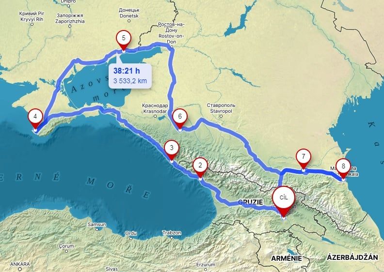 Startem i cílem je gruzínské hlavní město Tbilisi (označeno jako cíl). Samotná pouť ve stopách věrozvěstů začne na Krymu (4) a skončí u Kaspického moře (8).