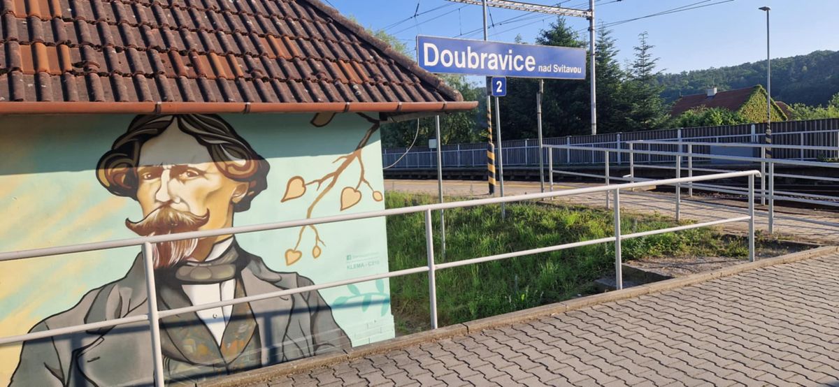 Na rušné železniční trase Břeclav Děčín lze u Doubravice na Blanensku spatřit na trafostanici na tamní zastávce výtvarníka Alfonse Muchu. Městys jej tam nechal před časem zvěčnit jako poděkování za to, že mu kdysi zařídil, aby v Doubravici zastavovaly vlaky, protože tam jezdil za kamarádem.