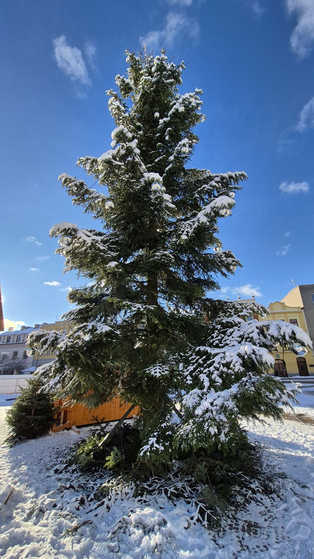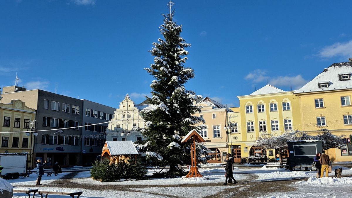 Náměstí Míru v Bruntále zdobí letos jedlička, podle některých obyvatel se však moc nevyvedla.