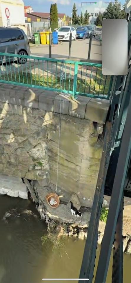 „Nechybí někomu černobílá kočka? Je pod cukrovarským mostem,“ oslovil facebookovou skupinu Břeclaváci Michal Čermák a připojil video, na které je vidět na laně zavěšený košík se žrádlem.