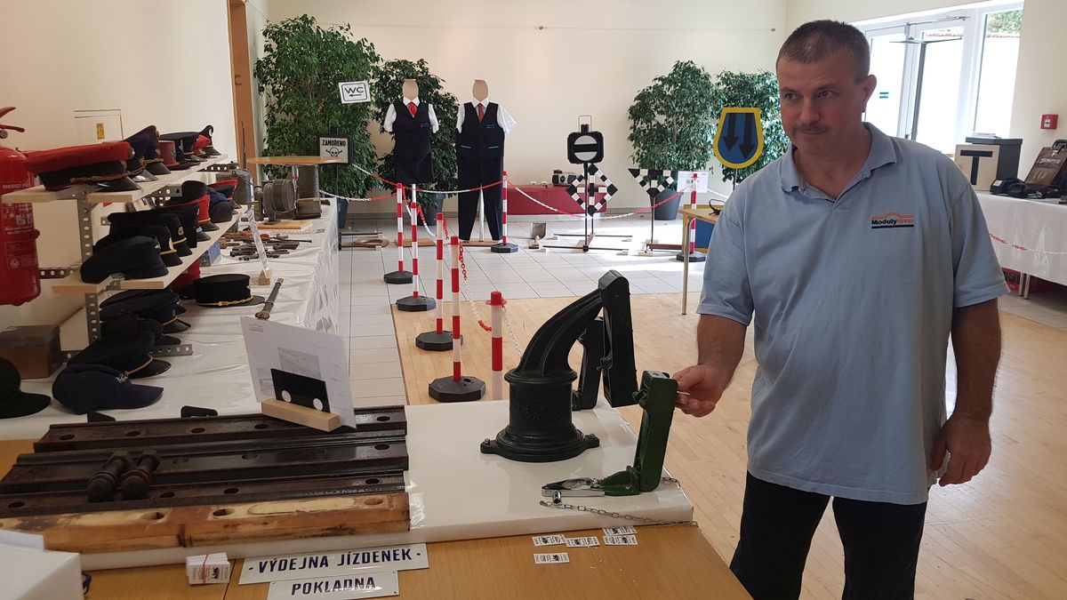 Sběratel předmětů spojených s historií železnice Marek Šafařík u ručního označovače jízdenek