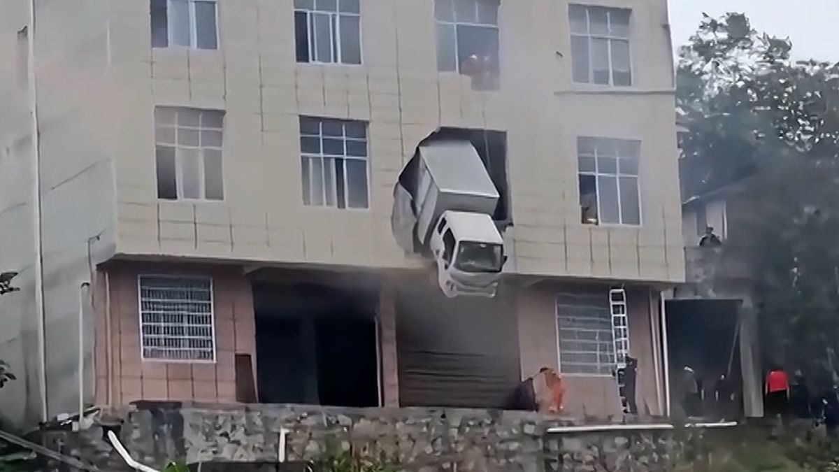 V malé obci Sin-čang, jež leží ve venkovské oblasti poblíž městečka Žung-mei v čínské provincii Chu-pej, došlo 1. listopadu k pozoruhodné nehodě. Místní hasiči totiž vyjížděli k záchraně řidiče nákladního auta, které viselo z prvního patra budovy stojící ve svahu, a hrozilo, že se i s řidičem uvnitř zřítí dolů.