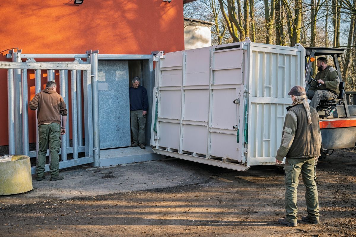 Nosorožec se převážel v kontejneru, odkud se přímo vpustil do svého výběhu.