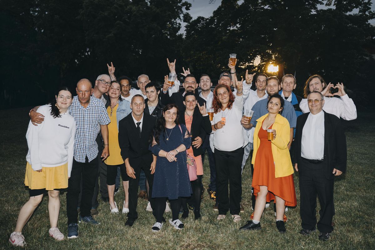 Lidé bez domova na oslavě. Někteří z nich už se dostali z ulice a postavili se zase na vlastní nohy. Na snímku je s nimi kněz Martin Sedloň.