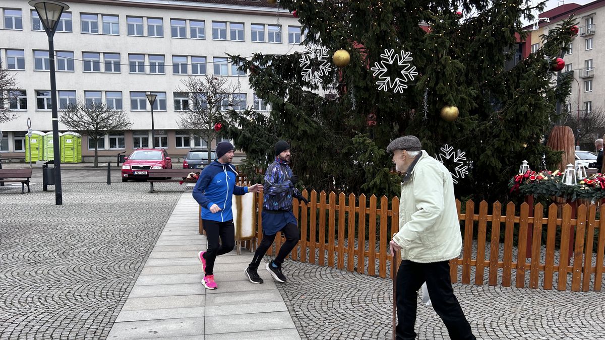 Kolečko kolem vánočního stromu na blanenském centrálním náměstí Republiky měří 15 metrů. Při běhu zlobilo elektronické měření uběhnutého úseku na hodinkách, proto každý z borců dal trasu o přibližně dva kilometry delší.