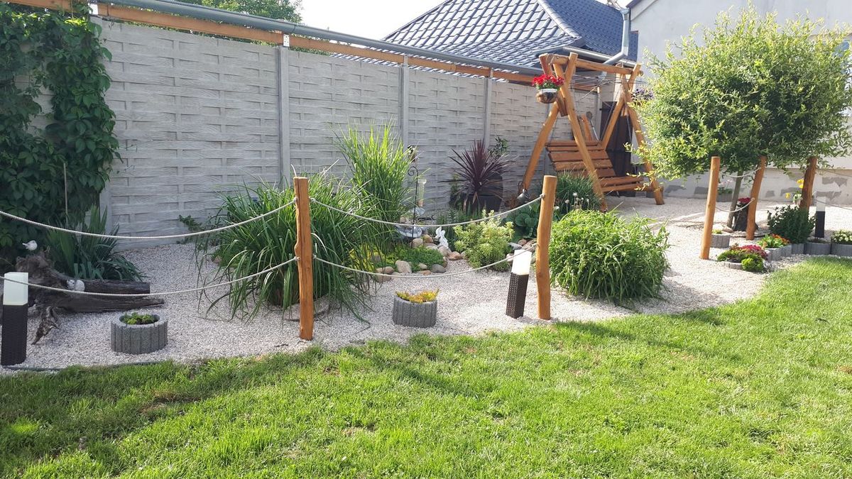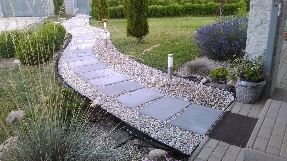 Neviditelné obrubníky ohraničující trávník a štěrkovou plochu